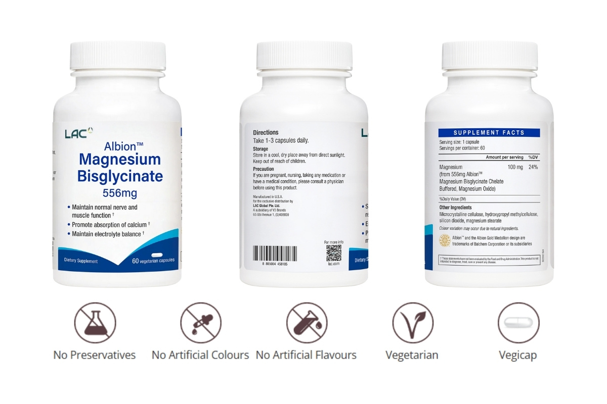 556mg Magnesium Bisglycinate / 60 capsules – Provides 100mg elemental magnesium