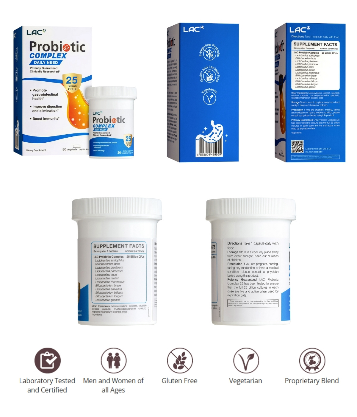 LAC Probiotic Complex Lactobacillus acidophilus, Bifidobacterium lactis, Lactobacillus plantarum, Lactobacillus paracasei, Lactobacillus rhamnosus, Lactobacillus salivarius |